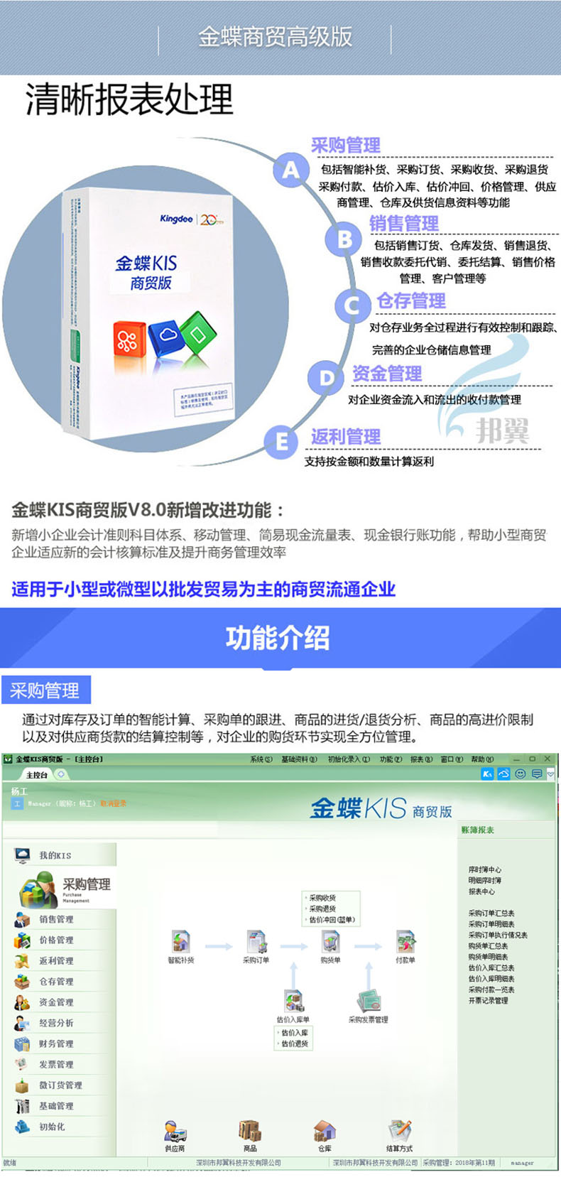 金蝶KIS商貿(mào)版專為商貿(mào)流通型小微企業(yè)設(shè)計(jì),通過幫助企業(yè)建立規(guī)范的業(yè)務(wù)管理流程,提升業(yè)務(wù)協(xié)作效率;同時(shí)可安全有效地管理客戶、供應(yīng)商、商品及價(jià)格等關(guān)鍵業(yè)務(wù)信息,清晰管理庫存和資金等重要資產(chǎn),無縫連接稅務(wù)系統(tǒng),準(zhǔn)確核算企業(yè)收入與成本,實(shí)現(xiàn)財(cái)務(wù)業(yè)務(wù)稅務(wù)一體化管理。金蝶KIS商貿(mào)系列包含商貿(mào)高級版、商貿(mào)標(biāo)準(zhǔn)版、商貿(mào)標(biāo)準(zhǔn)版業(yè)務(wù)包。